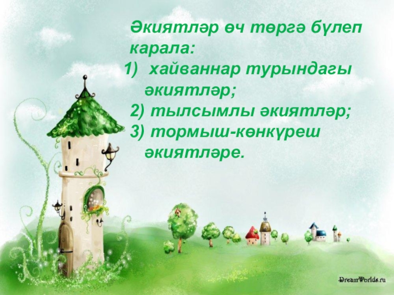 Слайд 4Әкиятләр өч төргә бүлеп карала: