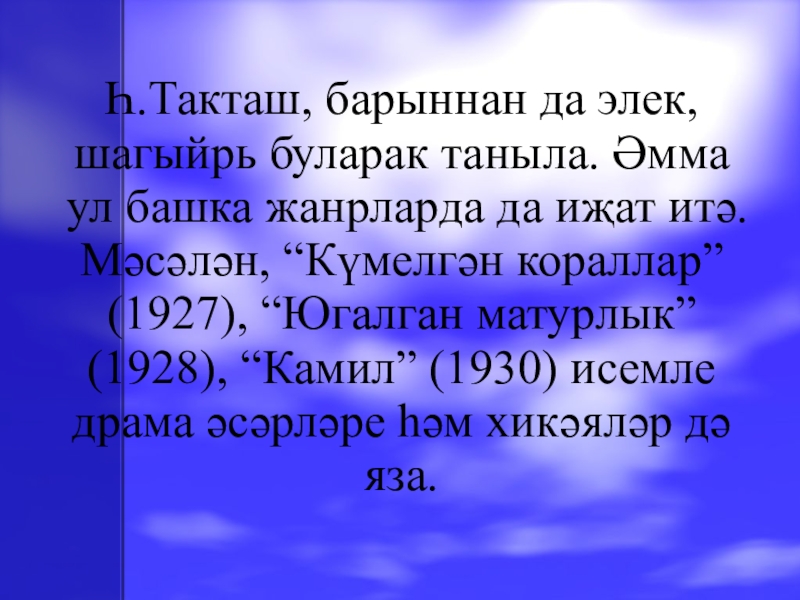 Слайд 15Һ.Такташ, барыннан да элек, шагыйрь буларак таныла. Әмма ул башка жанрларда
