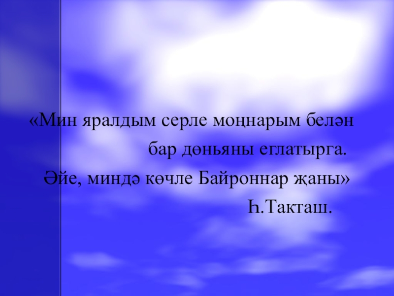 «Мин яралдым серле моңнарым белән                        бар дөньяны еглатырга. Әйе, миндә көчле Байроннар җаны»                                            Һ.Такташ.