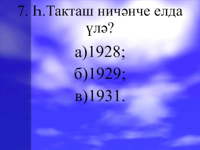 7. Һ.Такташ ничәнче елда үлә? а)1928; б)1929; в)1931.