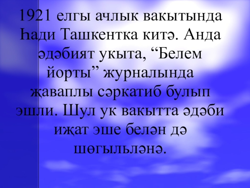 Слайд 121921 елгы ачлык вакытында Һади Ташкентка китә. Анда әдәбият укыта, “Белем