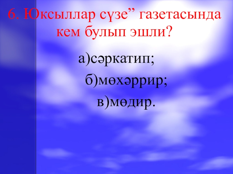 6. Юксыллар сүзе” газетасында кем булып эшли? а)сәркатип;   б)мөхәррир;   в)мөдир.