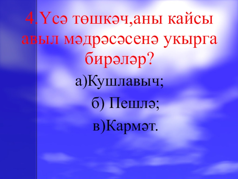 4.Үсә төшкәч,аны кайсы авыл мәдрәсәсенә укырга бирәләр? а)Кушлавыч;  б) Пешлә;  в)Кармәт.