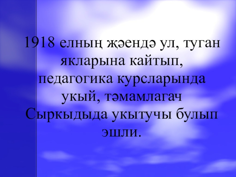 Слайд 101918 елның җәендә ул, туган якларына кайтып, педагогика курсларында укый, тәмамлагач