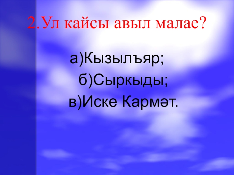 2.Ул кайсы авыл малае? а)Кызылъяр;  б)Сыркыды;  в)Иске Кармәт.
