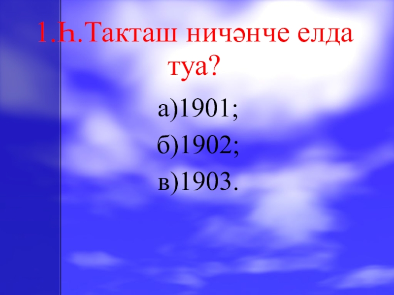 1.Һ.Такташ ничәнче елда туа?а)1901;б)1902;в)1903.