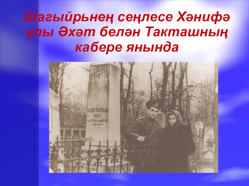 Слайд 21Шагыйрьнең сеңлесе Хәнифә улы Әхәт белән Такташның кабере янында