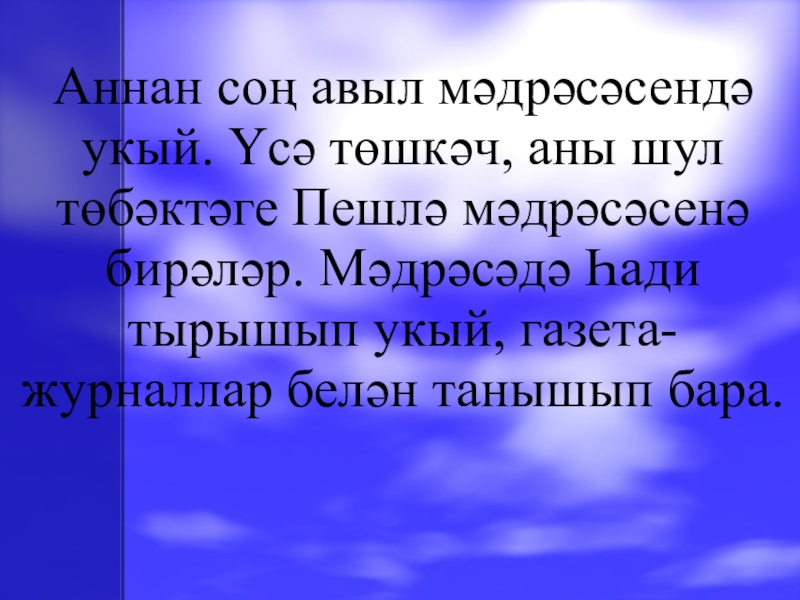 Слайд 5Аннан соң авыл мәдрәсәсендә укый. Үсә төшкәч, аны шул төбәктәге Пешлә