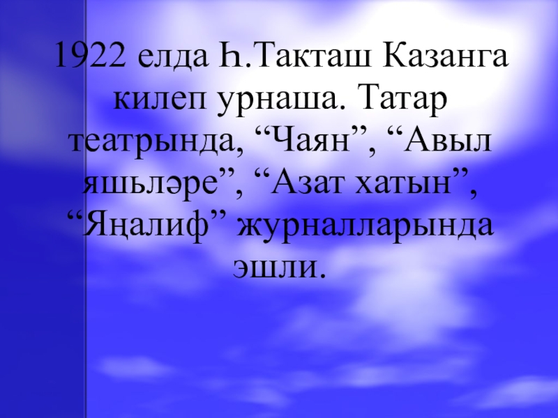 Слайд 131922 елда Һ.Такташ Казанга килеп урнаша. Татар театрында, “Чаян”, “Авыл яшьләре”,