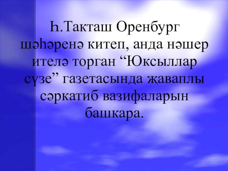 Слайд 11Һ.Такташ Оренбург шәһәренә китеп, анда нәшер ителә торган “Юксыллар сүзе” газетасында