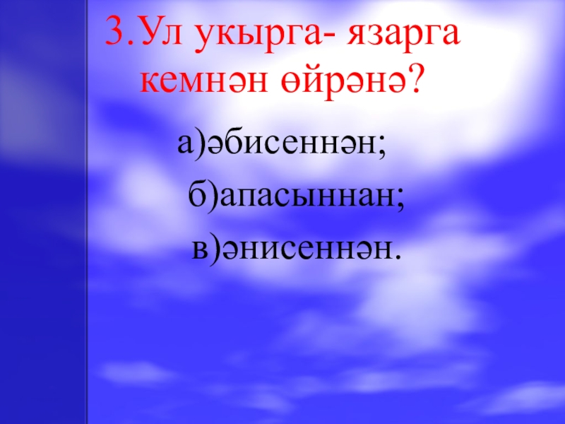3.Ул укырга- язарга кемнән өйрәнә? а)әбисеннән;  б)апасыннан;  в)әнисеннән.