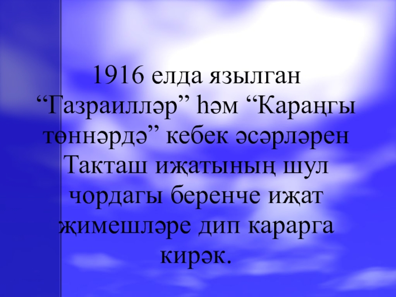 Слайд 91916 елда язылган “Газраилләр” һәм “Караңгы төннәрдә” кебек әсәрләрен Такташ иҗатының