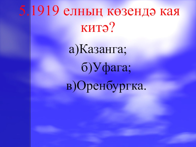 5.1919 елның көзендә кая китә? а)Казанга;   б)Уфага;   в)Оренбургка.