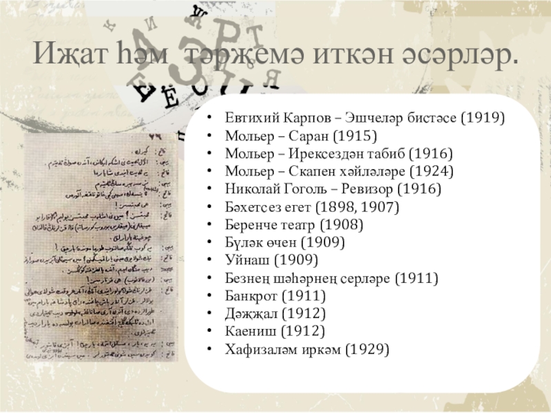 Слайд 7Иҗат һәм тәрҗемә иткән әсәрләр.