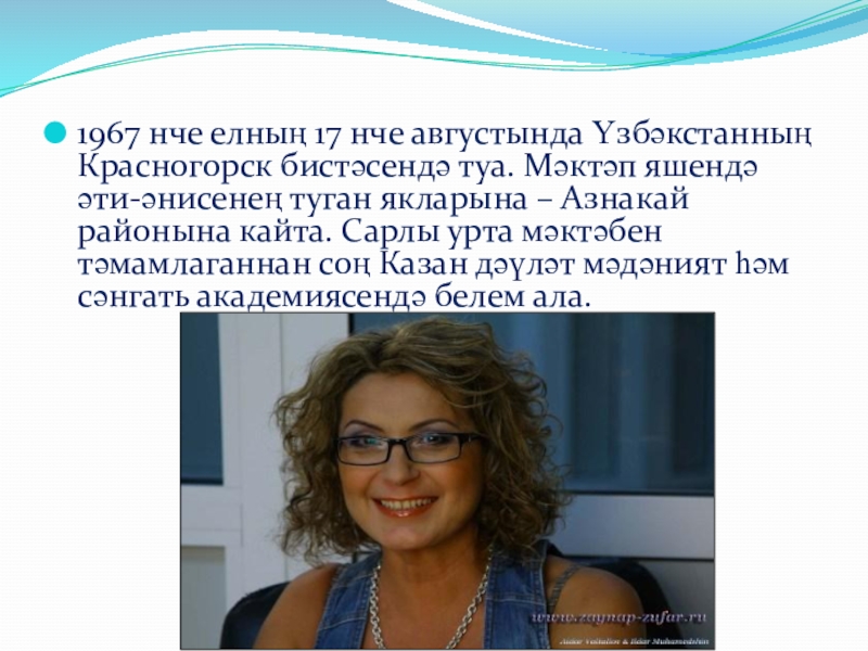 Слайд 41967 нче елның 17 нче августында Үзбәкстанның Красногорск бистәсендә туа. Мәктәп