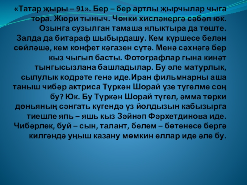 Жюри тыныч. Чөнки хисләнергә сәбәп юк. Озынга сузылган тамаша ялыктыра да төште. Залда да битараф шыбырдашу. Кем күршесе белән сөйләшә, кем конфет кәгазен сүтә. Менә сәхнәгә бер кыз чыгып басты. Фотографлар гына кинәт тынгысызлана башладылар. Бу әле матурлык,сылулык кодрәте генә иде.Иран фильмнарны аша таныш чибәр актриса Түркән Шорай үзе түгелме соң бу? Юк. Бу Түркән Шорай түгел, әмма төрки дөньяның сәнгать күгендә үз йолдызын кабызырга тиешле япь – яшь кыз Зәйнәп Фәрхетдинова иде. Чибәрлек, буй – сын, талант, белем – бөтенесе бергә килгәндә уңыш казану мөмкин еллар иде әле бу.