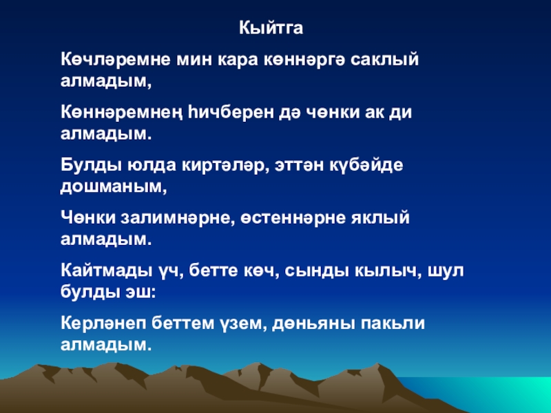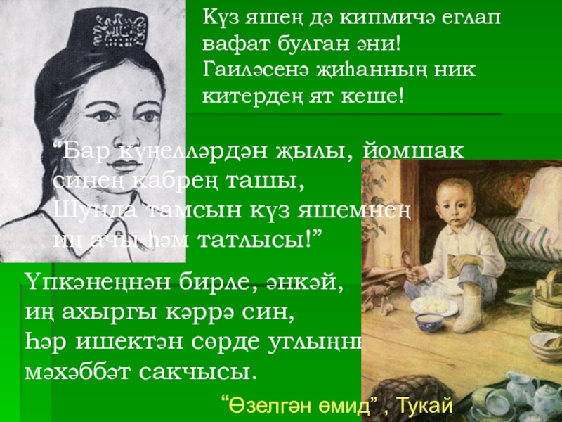 “Бар күңелләрдән җылы, йомшак синең кабрең ташы, Шунда тамсын күз яшемнең иң ачы һәм татлысы!”
