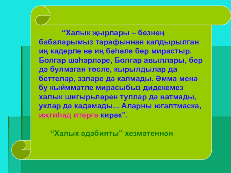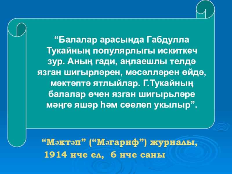 “Балалар арасында Габдулла Тукайның популярлыгы искиткеч зур. Аның гади, аңлаешлы телдә язган шигырләрен, мәсәлләрен өйдә, мәктәптә ятлыйлар. Г.Тукайның балалар өчен язган шигырьләре мәңге яшәр һәм сөелеп укылыр”.