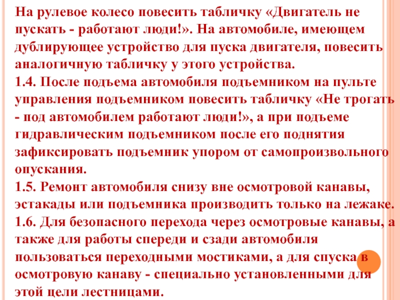 1.4. После подъема автомобиля подъемником на пульте управления подъемником повесить табличку «Не трогать - под автомобилем работают люди!», а при подъеме гидравлическим подъемником после его поднятия зафиксировать подъемник упором от самопроизвольного опускания.