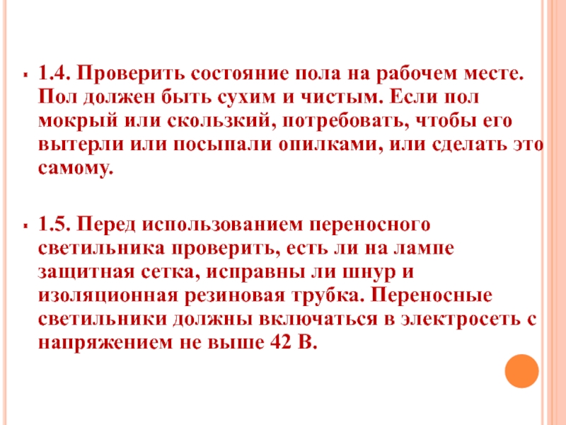 1.4. Проверить состояние пола на рабочем месте. Пол должен быть сухим