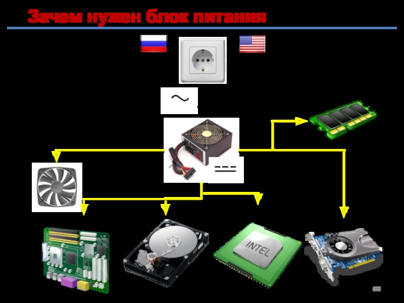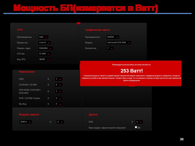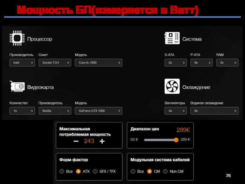 Мощность блока питания рассчитывается как сумма мощности всех компонентов компьютера