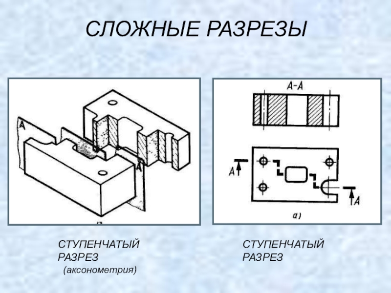 СЛОЖНЫЕ РАЗРЕЗЫСТУПЕНЧАТЫЙ РАЗРЕЗ (аксонометрия)СТУПЕНЧАТЫЙ РАЗРЕЗ