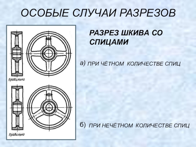 ОСОБЫЕ СЛУЧАИ РАЗРЕЗОВа)б)РАЗРЕЗ ШКИВА СО СПИЦАМИПРИ ЧЁТНОМ КОЛИЧЕСТВЕ СПИЦ ПРИ НЕЧЁТНОМ КОЛИЧЕСТВЕ СПИЦ