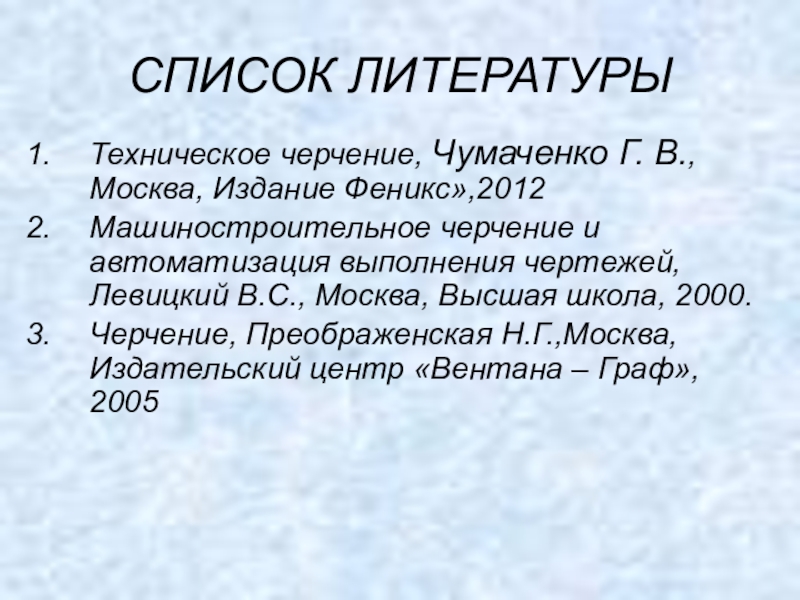 СПИСОК ЛИТЕРАТУРЫТехническое черчение, Чумаченко Г. В., Москва, Издание Феникс»,2012Машиностроительное черчение и автоматизация выполнения чертежей, Левицкий B.C., Москва,