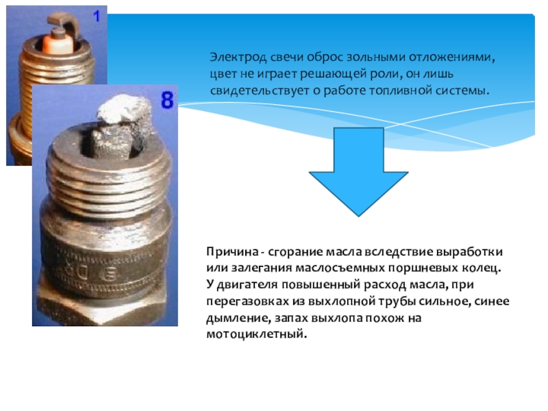 Причина - сгорание масла вследствие выработки или залегания маслосъемных поршневых колец.