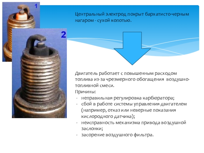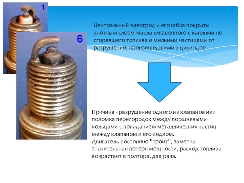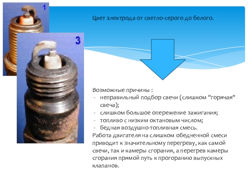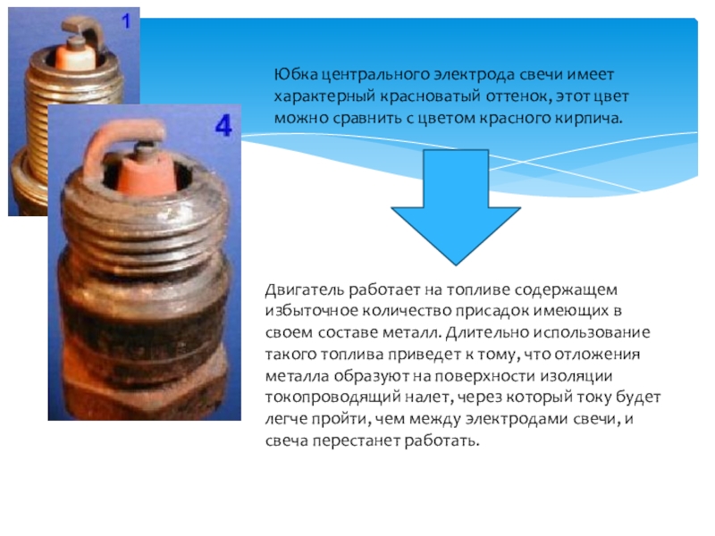 Двигатель работает на топливе содержащем избыточное количество присадок имеющих в своем составе металл. Длительно использование такого топлива приведет к тому, что отложения металла образуют на поверхности изоляции токопроводящий налет, через который току будет легче пройти, чем между электродами свечи, и свеча перестанет работать.