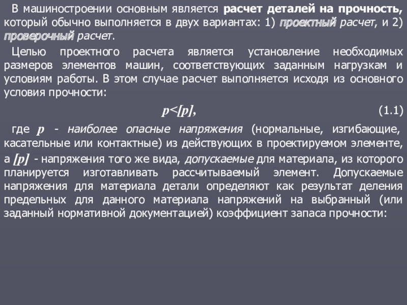 Целью проектного расчета является установление необходимых размеров элементов машин, соответствующих заданным нагрузкам и условиям работы. В этом случае расчет выполняется исходя из основного условия прочности: