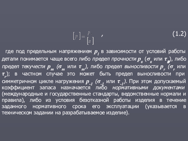 понимается чаще всего либо предел прочности рв (σв или τв), либо предел текучести рт (σт или τт), либо предел выносливости рr (σr или τr); в частном случае это может быть предел выносливости при симметричном цикле нагружения р-1 (σ-1 или τ-1). При этом допускаемый коэффициент запаса назначается либо нормативными документами (международные и государственные стандарты, ведомственные нормали и правила), либо из условия безотказной работы изделия в течение заданного нормативного срока его эксплуатации (указывается в техническом задании на разрабатываемое изделие).