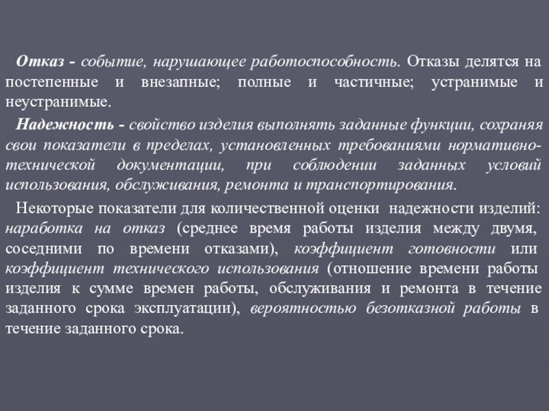 Слайд 10Отказ - событие, нарушающее работоспособность. Отказы делятся на постепенные и внезапные;