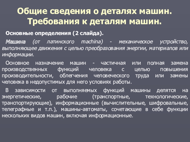Основное назначение машин - частичная или полная замена производственных функций человека с целью повышения производительности, облегчения человеческого труда или замены человека в недопустимых для него условиях работы.