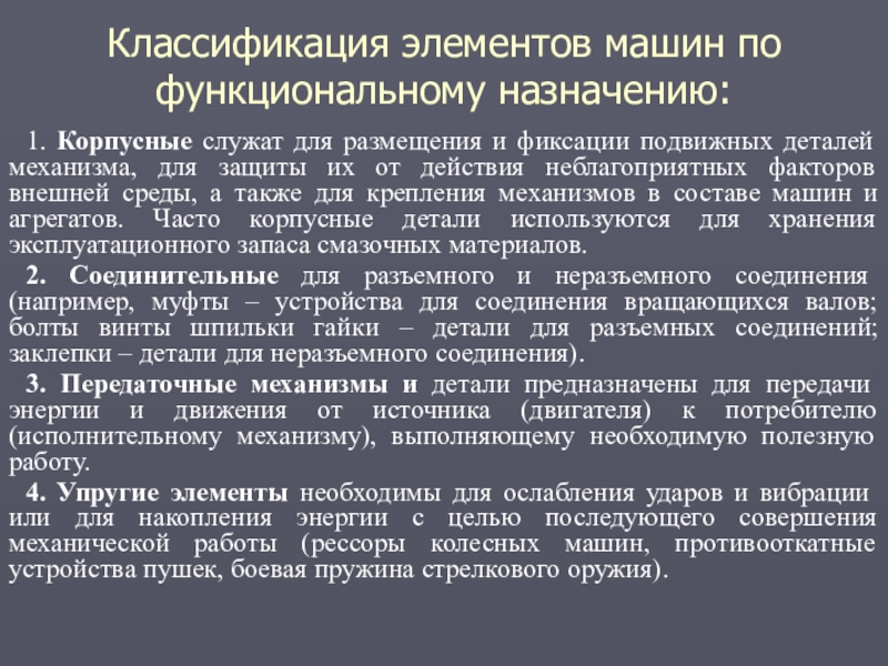 Слайд 71. Корпусные служат для размещения и фиксации подвижных деталей механизма, для