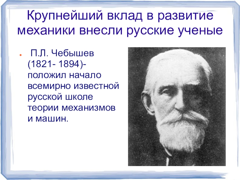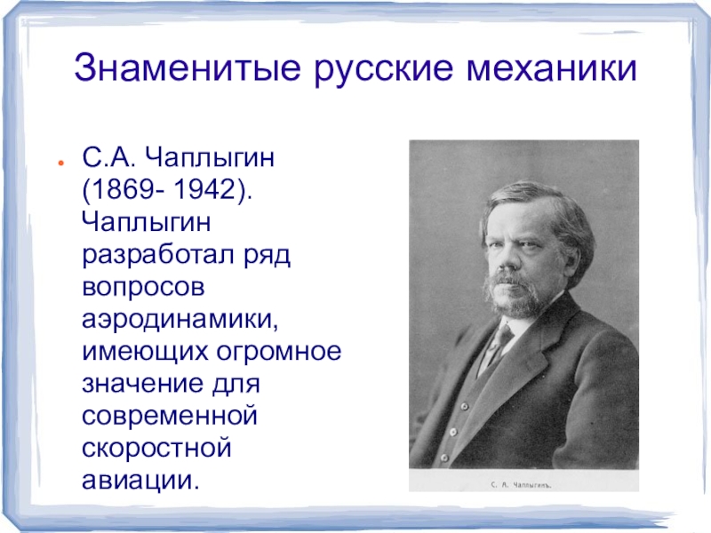 С.А. Чаплыгин (1869- 1942). Чаплыгин разработал ряд вопросов аэродинамики,