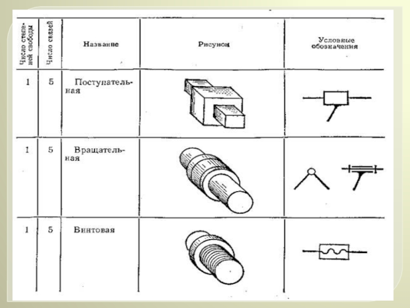 Плоские кинематические пары подразделяются на вращательные, поступательные и высшие