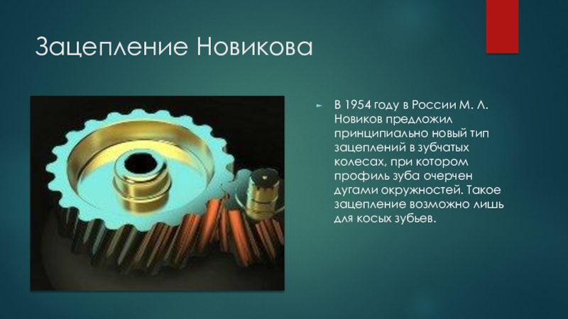 новый тип зацеплений в зубчатых колесах, при котором профиль зуба очерчен дугами окружностей. Такое зацепление возможно лишь для косых зубьев.