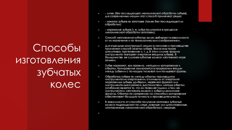 Способ изготовления зубчатых колес выбирают в зависимости от их назначения и по технологическим соображениям.