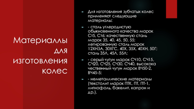 углеродистую обыкновенного качества марок Ст5, Ст6; качественную сталь марок 35, 40, 45, 50, 55; легированную сталь марок 12ХНЗА, 30ХГС, 40Х, 35Х, 40ХН, 50Г; сталь 35Л, 45Л, 55Л;