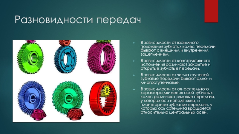 В зависимости от взаимного положения зубчатых колес передачи бывают с