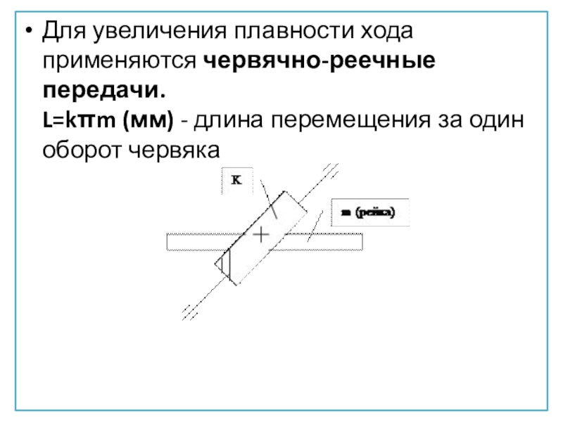 Слайд 22Для увеличения плавности хода применяются червячно-реечные передачи.