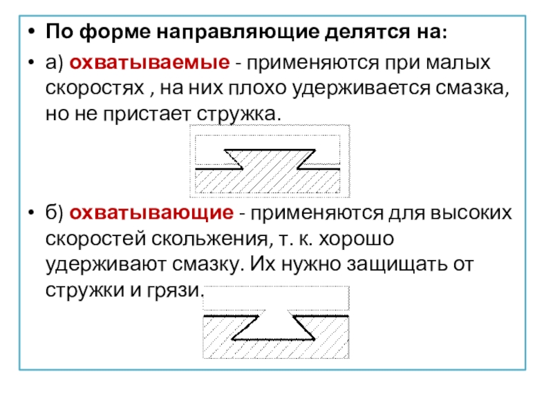б) охватывающие - применяются для высоких скоростей скольжения, т. к. хорошо удерживают смазку. Их нужно защищать от стружки и грязи.
