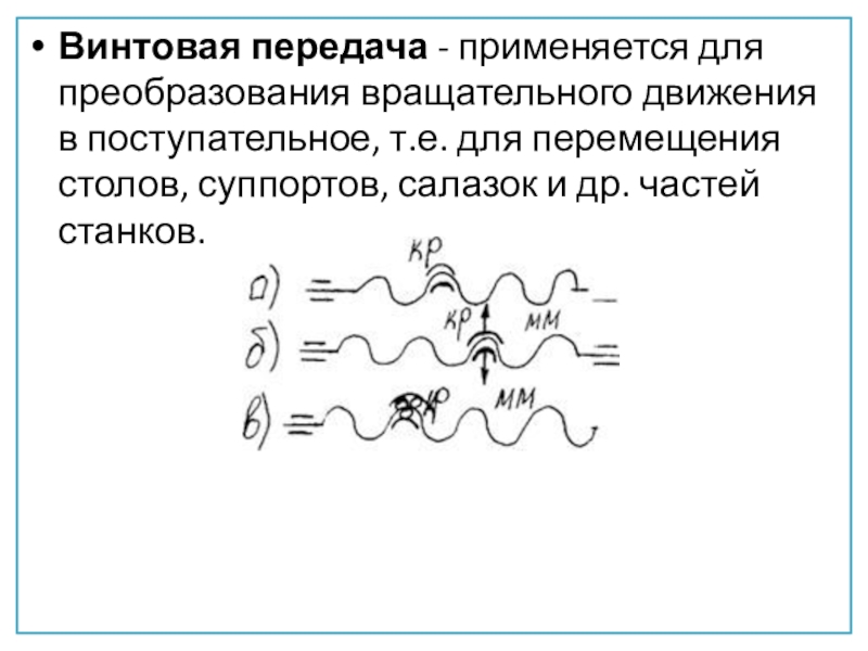 Слайд 23Винтовая передача - применяется для преобразования вращательного движения в поступательное, т.е. для