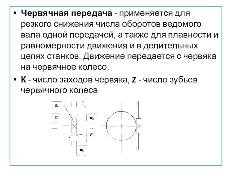 передачей, а также для плавности и равномерности движения и в делительных цепях станков. Движение передается с червяка на червячное колесо.