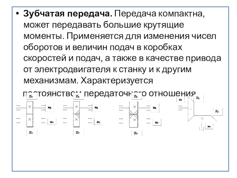 Слайд 19Зубчатая передача. Передача компактна, может передавать большие крутящие моменты. Применяется для изменения