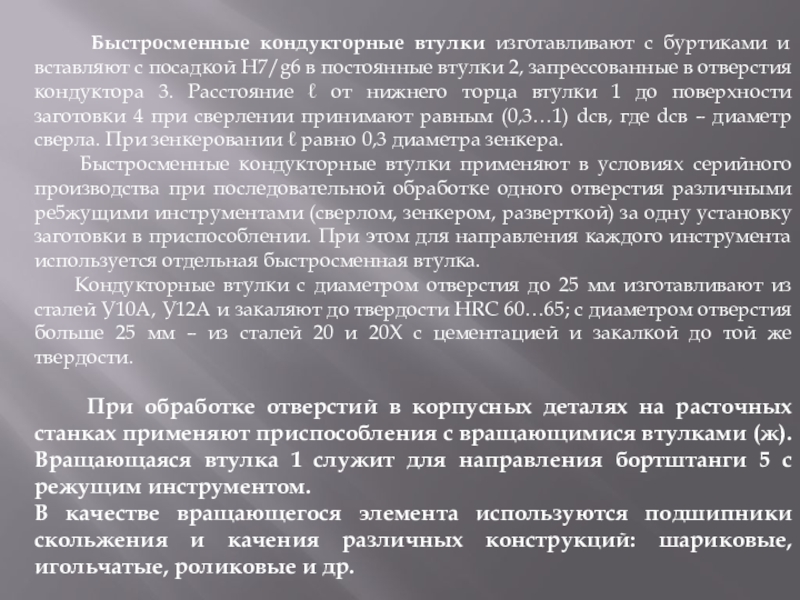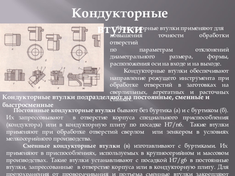 Их запрессовывают в отверстие корпуса специального приспособления (кондуктора) или в кондукторную плиту по посадке Н7/n6. Такие втулки применяют при обработке отверстий сверлом или зенкером в условиях мелкосерийного производства.
