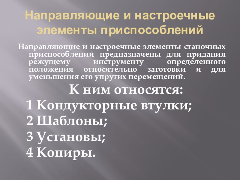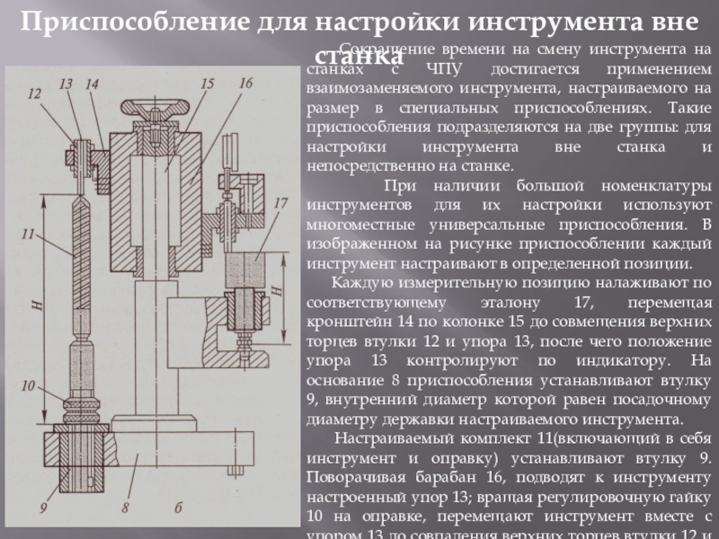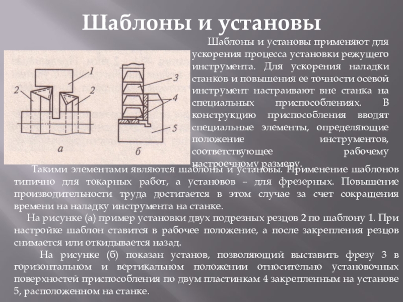 Такими элементами являются шаблоны и установы. Применение шаблонов типично для токарных работ, а установов – для фрезерных. Повышение производительности труда достигается в этом случае за счет сокращения времени на наладку инструмента на станке.