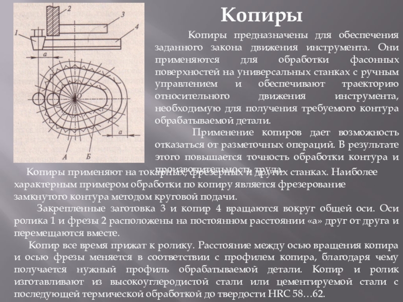 Копир все время прижат к ролику. Расстояние между осью вращения копира и осью фрезы меняется в соответствии с профилем копира, благодаря чему получается нужный профиль обрабатываемой детали. Копир и ролик изготавливают из высокоуглеродистой стали или цементируемой стали с последующей термической обработкой до твердости НRC 58…62.