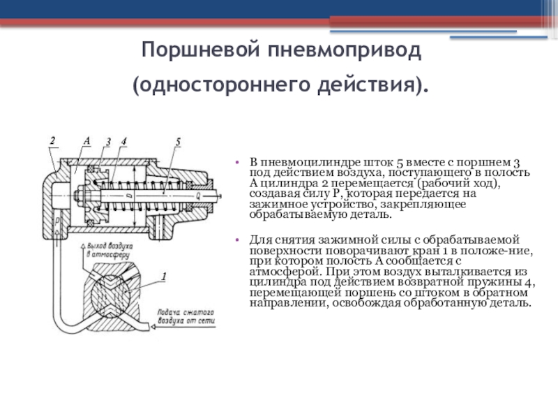 Слайд 6Поршневой пневмопривод (одностороннего действия).